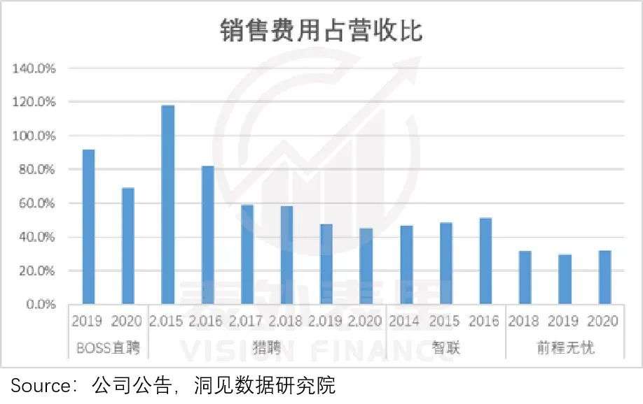 BOSS直聘的营销数据也反映出其对用户增长的大力投入。财报显示,BOSS直聘销售费用占比近70%,这和猎聘15-16年快速发展阶段的情况类似。