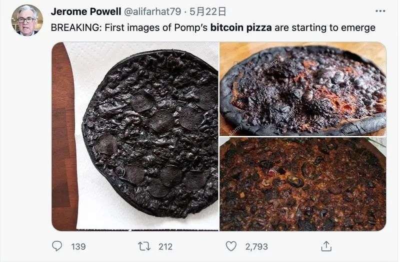 讽刺账号“鲍威尔”在比特币披萨节当天的讽刺推文:币圈大佬Pomp做的比萨长这样