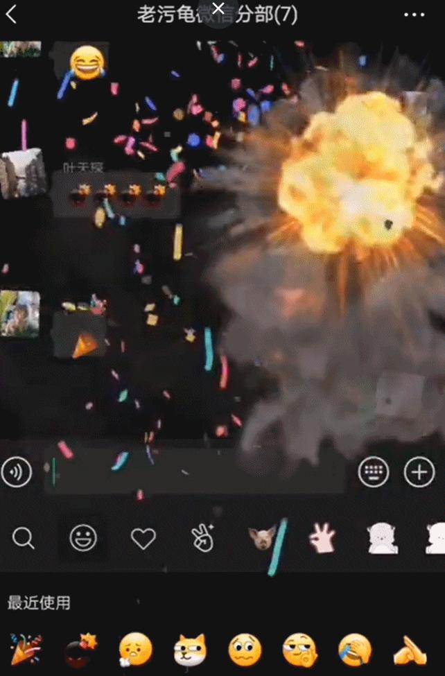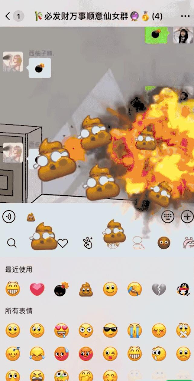 说白了:一个人发便便表情后,另一个人立刻发炸弹表情,即可触发炸屎特效。