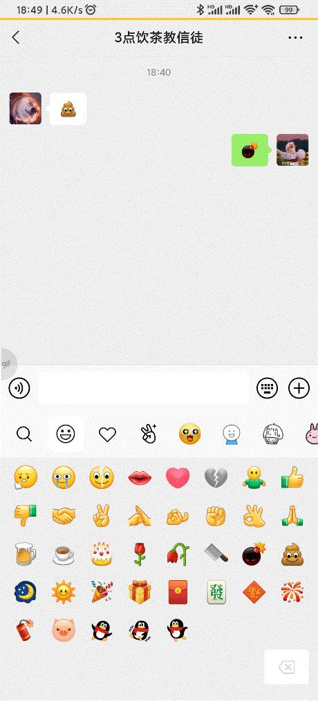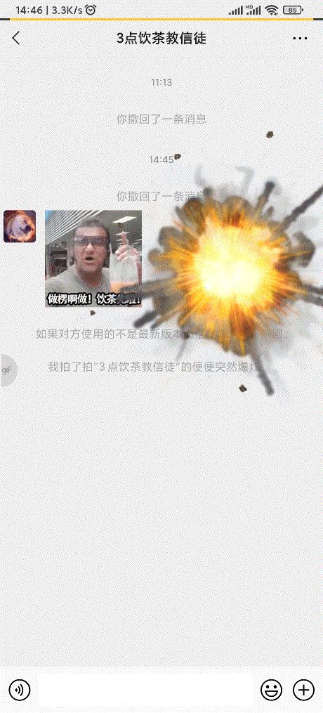 好友发送便便表情3秒后,我们再发炸弹表情,此时无法触发炸屎效果,只显示普通的爆炸。