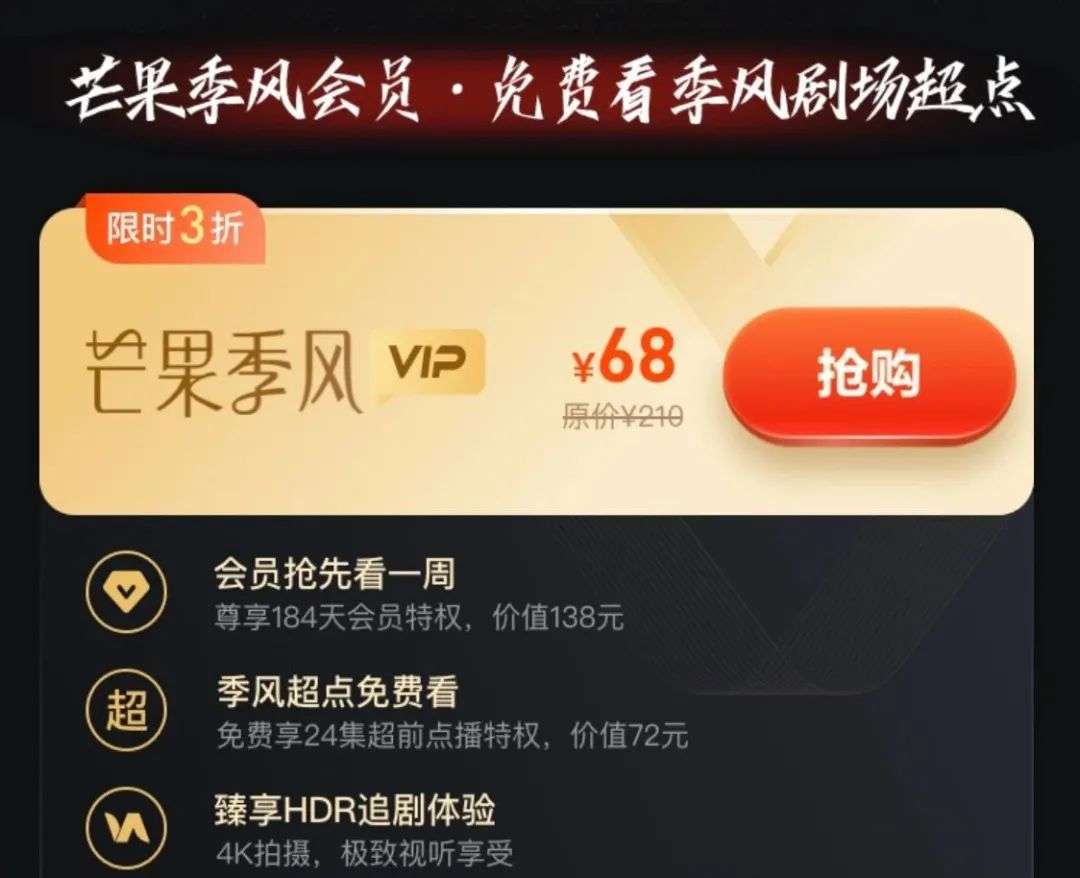 目前,芒果TV基于原有的会员体系,额外推出了68元的“季风半年会员”服务,订阅该服务的用户可享有184天会员特权、免费24集超前点播特权,HDR追剧体验,以及其他会员特权。这种运营方式类似其他平台基于超前点播对于会员体系的升级。