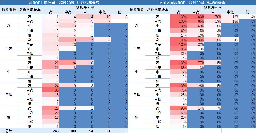 上图是423家ROE超过20%上市公司的杜邦三因素分布,我们可以发现,对于这些高ROE上市公司而言,总资产周转率和销售净利率的分布接近,指标值集中落在了全部A股的高和中高两个区间,而权益乘数在五个区间中的分布很接近,并没有体现出明显的区别。