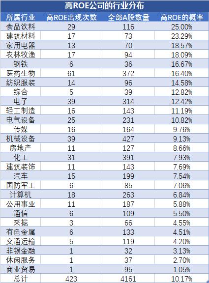 在全部4161家上市公司中,ROE超过20%的优秀公司共有423家,10%的概率多一点。从上面的表格,我们可以发现以下几个行业特征: