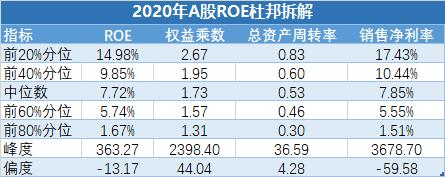 第三、如果一家上市公司想做到高于20%的ROE,那销售净利率和总资产周转率这两个指标,必须至少有一个指标进入前20%,按照2020年报的数据,销售净利率大于17.43%,或者总资产周转率大于0.83,每一个想要实现的难度都不小。