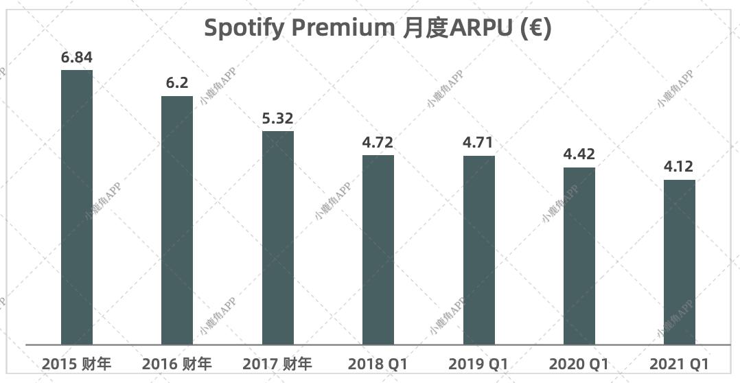 在经历了突飞猛进的2020年后,Spotify最新的一季度财报显示Premium层级的每用户贡献收入(ARPU)同比下降了7%,为4.12欧元,相比2015财年的数据已下降近四成,而该季度仍有亏损近1.25亿欧元。也正是迫于缓解经营压力并提高ARPU,Spotify上个月在包括美国、英国、巴西在内的多个关键市场首次提价,尽管这些提价仅限于家庭订阅等混合订阅套餐,并未波及个人订阅者。