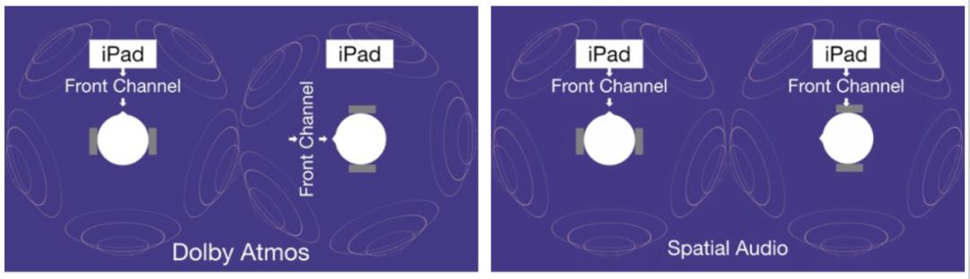 首先需要明确的是杜比全景声(Dolby Atmos)并不等于苹果提出的空间音频(Spatial Audio)。前者是由杜比实验室推出的一种音频格式,音乐制作人需要对音乐母带进行处理来营造出沉浸体验感,而苹果提出的空间音频则是通过耳机内和播放源设备内的陀螺仪与运动传感器来模拟动态环境下的沉浸式的声场体验。