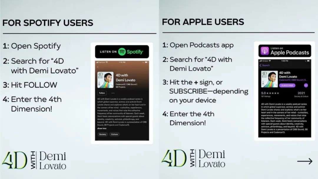 Demi Lovato便开通了自己的周更播客栏目“4D With Demi”,在首期节目中,Demi公开了自己的非二元性别身份(认为自己的性别处在男性和女性之间),粉丝们也被她的态度所打动,并鼓励她积极面对人生。Demi近年一直饱受着精神疾病的困扰,在播客中,一直在持续地讨论心理健康的内容。