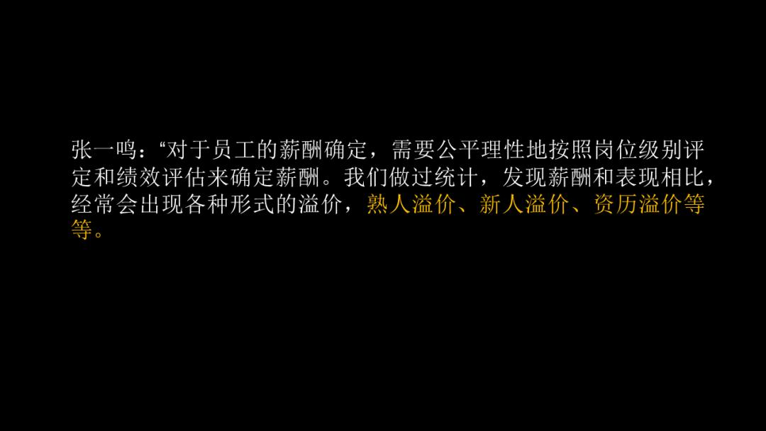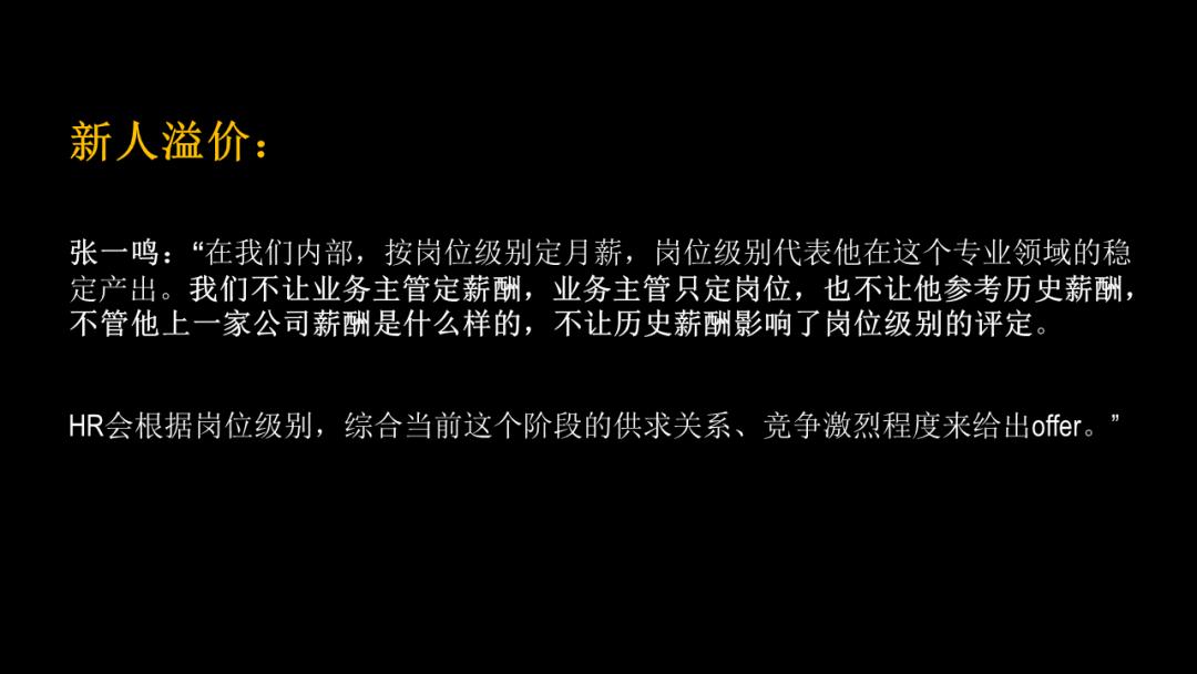 怎么解决?张一鸣认为,公司要按照岗位级别定月薪。岗位级别代表着稳定的月薪,如果你有突出贡献,公司可以用奖金来体现。其次,让HR而非业务主管来定薪酬,HR在定薪酬时也用不参考这个人的历史薪酬。HR会根据岗位级别,综合人才市场上的供求关系,给到一个最终的offer。