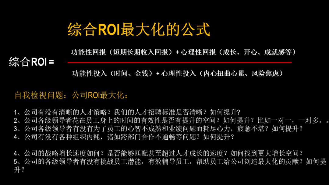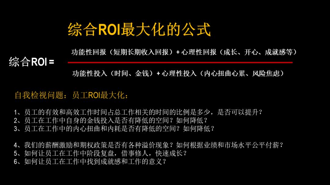 对于员工来说也是一样,他为什么愿意加入你的公司,因为加入你的公司,个人投资回报率最大。