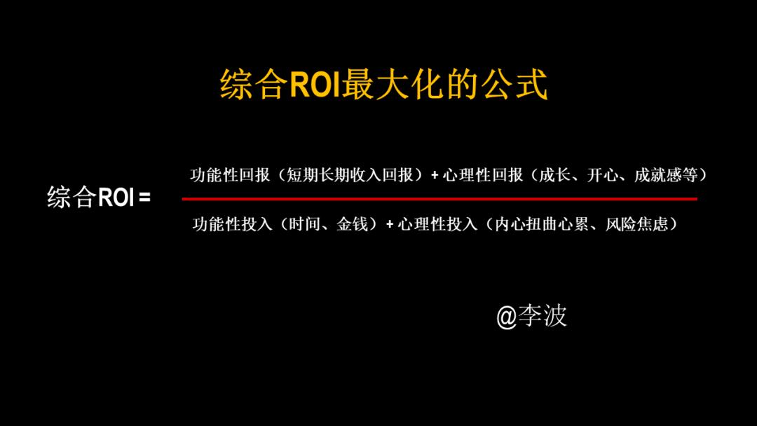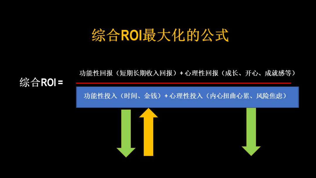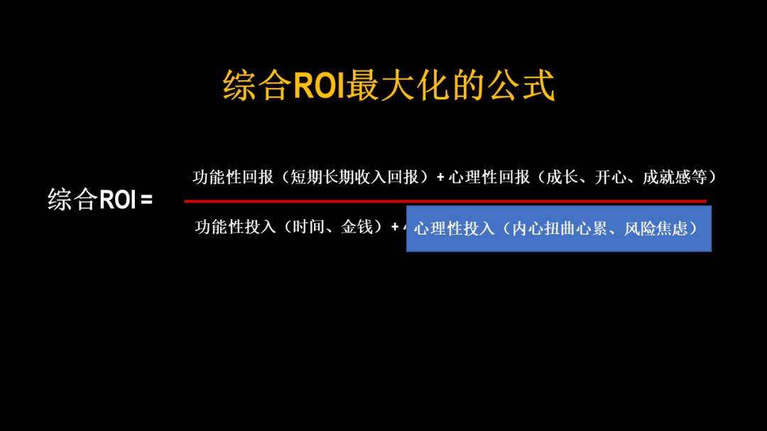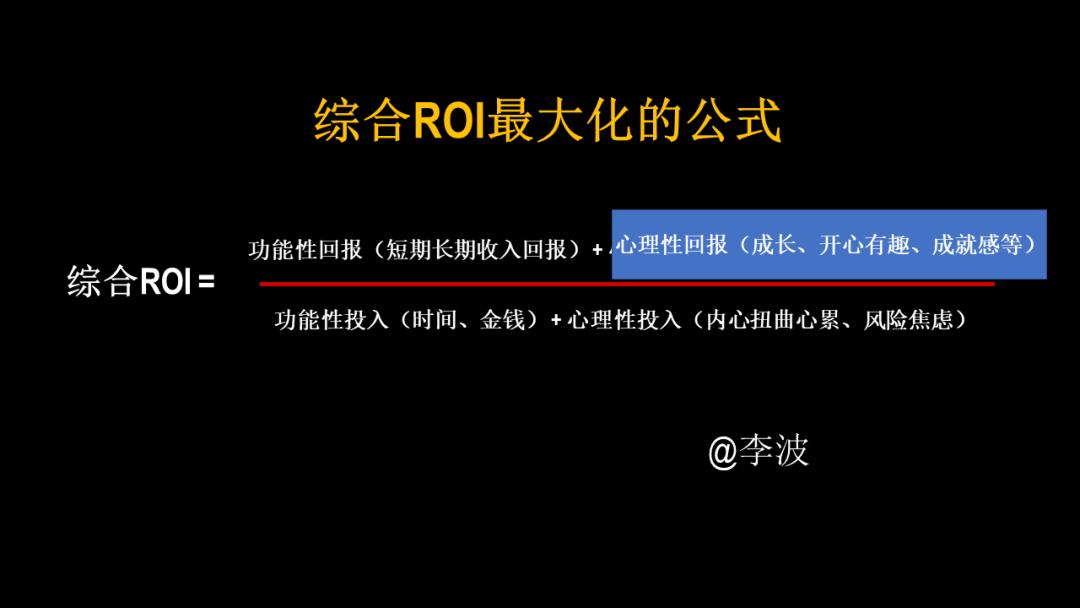 它的大小主要由四个元素来决定,分别是公式的分母端的功能性投入(投入的时间、金钱)加上心理性投入(内心疲惫、精神焦虑);分子端的功能性回报(长短期收入)加上心理性回报(开心、成就感、成长)。