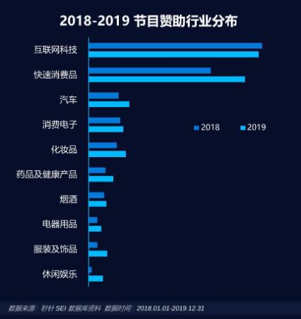 从2018-2019节目赞助行业分布情况,互联网科技仍然是稳居首位,而快消品紧随其后,而且投放增长明显,尤其是食品饮料行业。