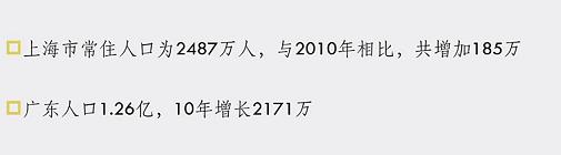 上海常住人口2487万,和十年前相比增加了185万,广东人口现在是1.26亿,十年期间增加了2171万,如果光给大家报这个数据,大家可能觉得这种比较有问题,上海是个市,广东是个省。