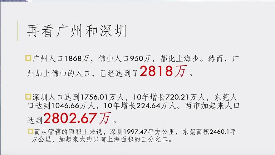 这就有意思了,从管辖面积上来讲,广州加上深圳的面积只有上海的2/3,中间隔的那条河,前面讲广州和佛山之间的珠江比黄浦江窄,而深圳和东莞是连成片的,没有自然的阻隔。