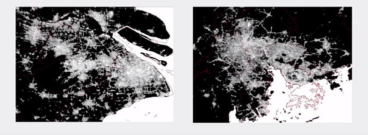 有了这个概念以后我们看左边这张图,这是我们最近和亚洲开发银行一起合作,用夜晚灯光看中国城市的发展。上海在自己的管辖范围之内,可能都很难叫一个城市,在上海南边的郊区,比如奉贤、金山这样的地方,可能和上海的中心城区没有形成连片发展的态势,尽管行政管辖上属于上海。