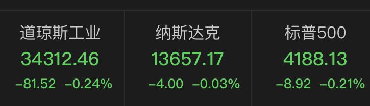 截至收盘,道指跌81.52点,报34312.46点,跌幅为0.24%;纳指跌4点,报13657.17点,跌幅为0.03%;标普500指数跌8.92点,报4188.13点,跌幅为0.21%。