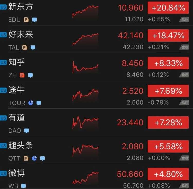 海淀教委澄清“教育机构暑期不许开课”为假消息,中概教育股纷纷暴涨,新东方涨20.84%,好未来涨18.47%,高途涨4.72%,有道涨7.28%,51Talk跌1.57%。