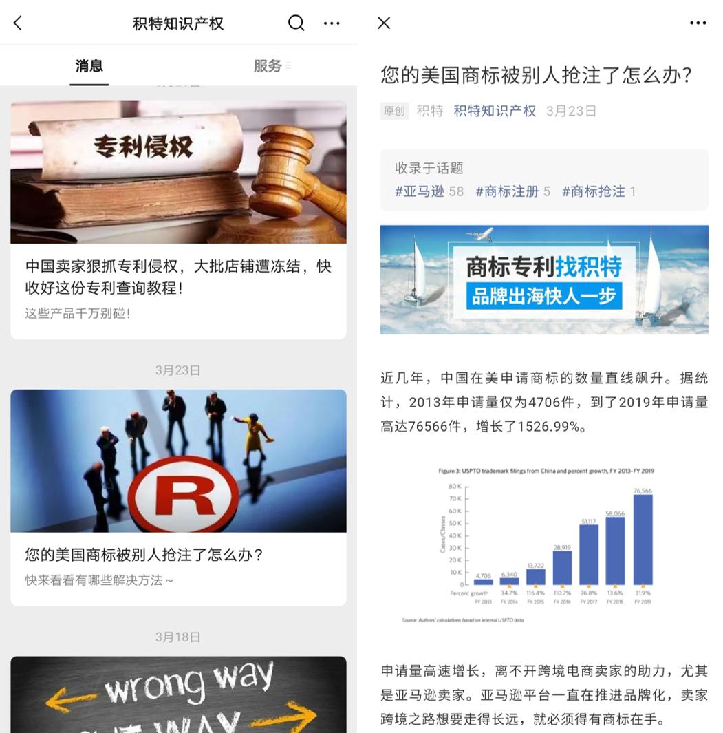 为解决这个难题,积特通过内容营销的方式去拉动销售。如:在官网上设立独立的经典案例板块、公众号上定期更新有关知识产权专业性的文章等等。