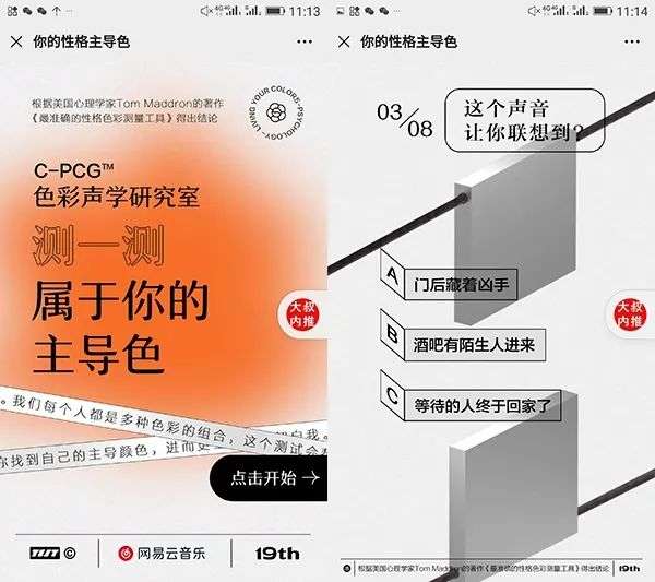 网易云音乐这次联合了一家叫做“19th创意工作室”,又基于色彩声学研究室的内容,制作了这么一个性格测试的H5。