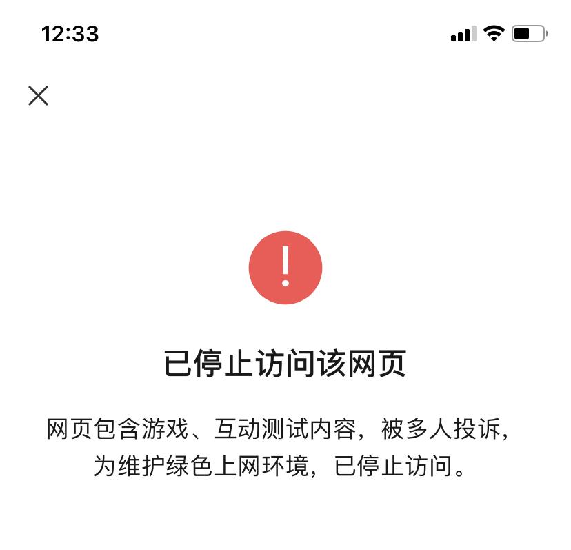 遗憾的是,这个H5只“存活”了半天吧,在今天中午12点左右,被微信封杀,理由是:“网页包含游戏、互动测试内容,被多人投诉,为维护绿色上网环境,已停止访问”。