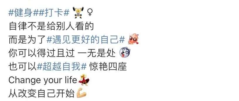 当代女性在健身时,也更加注重自己的主体性。从健身小组和社交媒体的帖子中可以看到,女性更多是将“身体健康”、“成为更好的自己”作为激励自己健身的理由。