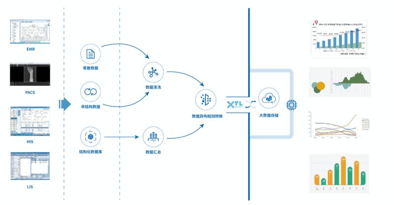 所以我们认为,解决这一难点的核心是找到一种非接口的方式实现数据同构处理。所以2016-2018年这三年,我们就围绕医疗数据化慢慢做,好比在水底下打桩。古珀自主研发了XTL技术(医疗数据清洗和结构化技术),其功能是在不影响原有业务系统基础上剥离出核心数据,进行清洗、汇总、异构规则转换等处理。另一项叫云梯技术,可实现数据的按需调用、分布式计算和授权共享,打通医院之间、区域之间的“信息孤岛”,处理后的数据依旧存储在本院的服务器中。