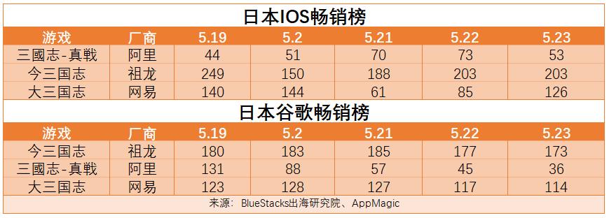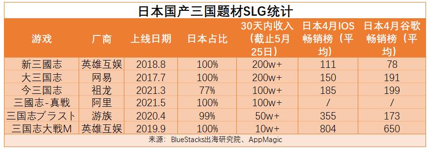 收入方面,近30天内(截至5月25日)网易的《率土之滨》日版《大三国志》和英雄互娱2018年上线的《新三国志》分别收入超过200万美金。祖龙的《今三国志》3月31上线后,在日本畅销榜稳定攀升。