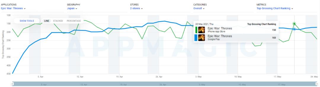 《今三国志》上线伊始在IOS和谷歌端位于畅销总榜200名开外,经过一个半月的运营,《今三国志》在5月20日位于IOS、谷歌畅销榜第150位和第183位。