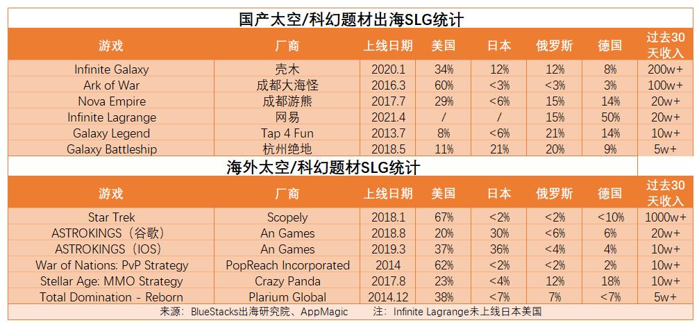 比起竞争激烈、耳熟能详的三国题材,太空/科幻题材在国内一直较为小众尤其是放在SLG手游里来看,但是在海外,网易科幻题材SLG《无尽的拉格朗日》已经上线了俄罗斯、德国等几个国家,壳木游戏的《Infinie Galaxy》也正在冲击美、日市场。海外的太空/科幻题材SLG还有不少老牌出海厂商的身影,以老游戏居多,这个题材依旧有着不错的市场空间等待突围。