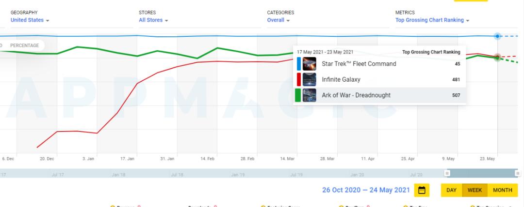 Scopely是当之无愧的太空SLG霸主,该游戏曾在19年3月份双渠道(IOS+谷歌)流水超过1370万美金。据Sensortower数据,2021年4月《StarTrek》的双渠道流水超过了1900万美金。