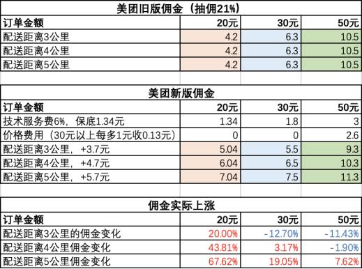 所谓“费率透明化”改革,就是原有的佣金拆为技术服务费与履约服务费,履约服务费根据配送距离、时段、价格等综合核定,按阶梯制收费。简单来说,就是商家的履约服务费由之前的统一标准,变成像打车一样的打表收费。