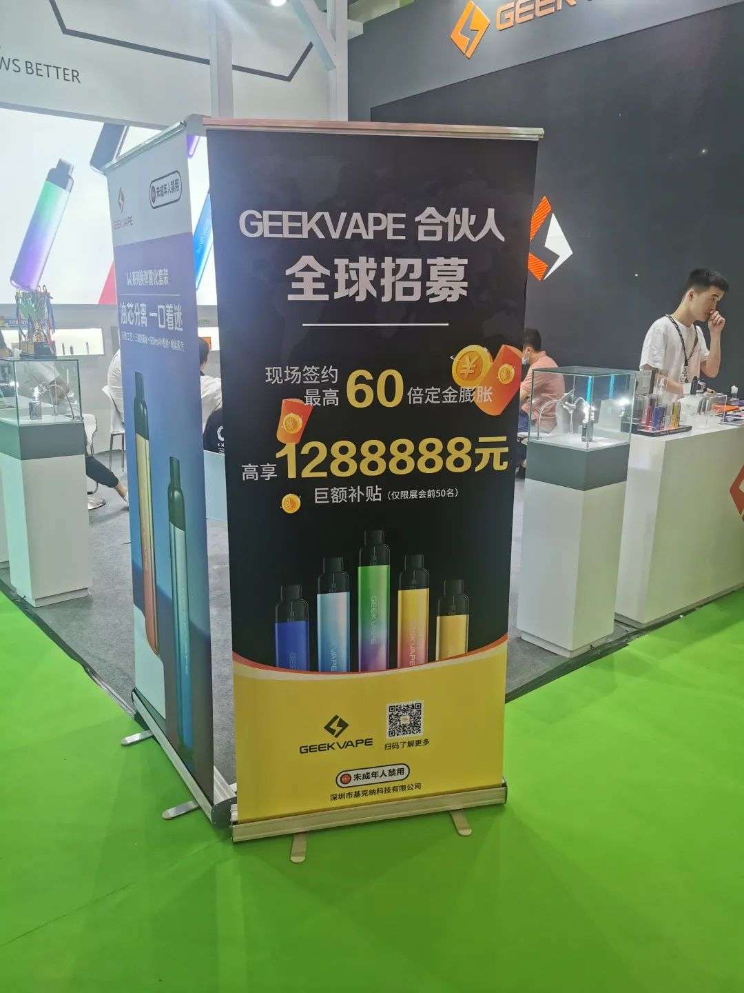 “现场签约,最高60倍定金膨胀,高享1288888元巨额补贴(仅限展会前50名)。”一张海报昭示着电子烟厂商对线下加盟商的渴求。