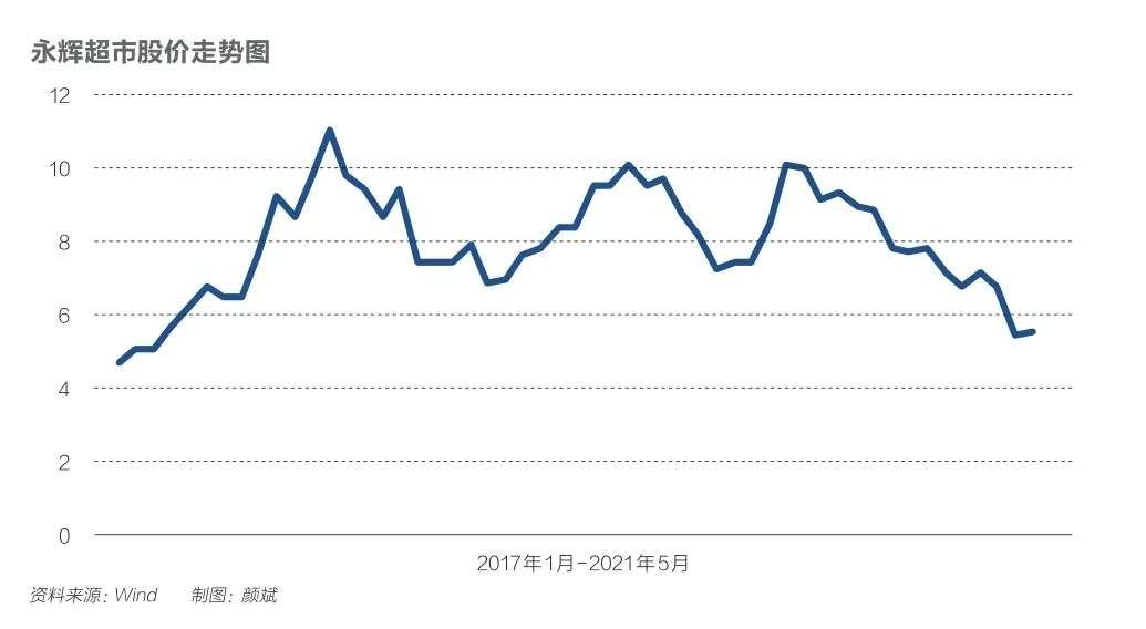 2017年,新零售概念是资本市场的宠儿。以超级物种为代表的新零售业态也在2017年将永辉的市值推向巅峰。在市场整体震荡的背景下,永辉超市(601933.SH)股价一路走高,从2017年初的4.76元一度涨到2018年1月的12.12元,市值翻了2.5倍,成为当年的现象级股票之一。