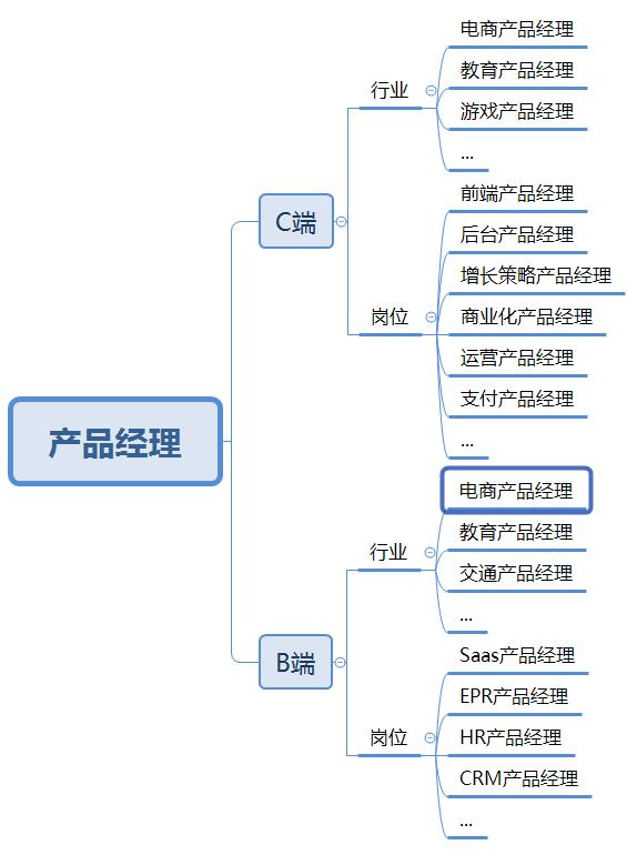 而对应的C端和B端之下,根据行业和岗位职能的不同,也可以划分出很多不同带有“前缀”的产品经理。