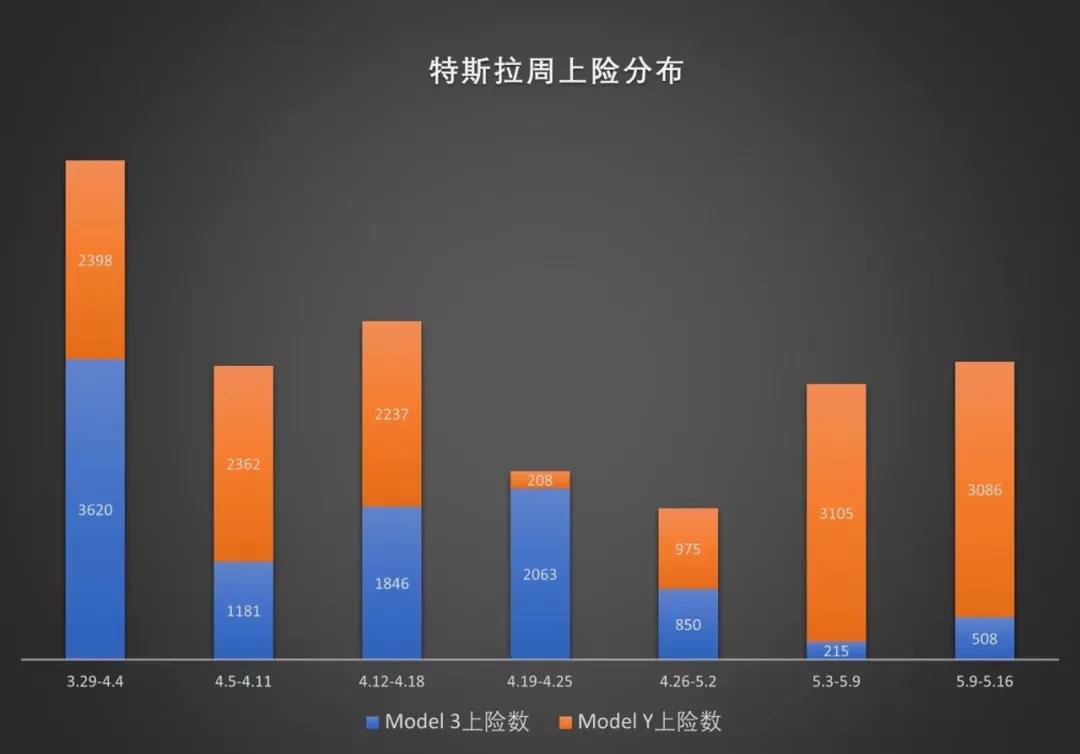 另据《电动汽车观察家》发布的数据显示,在5月前三周(4月26-5月16日)特斯拉Model3的上保险量分别为850辆、215辆、508辆,在前三周,Model3累计销量为1563辆,但这不及3月该车型20%的销量,更不及去年巅峰时刻月2万辆的10%。