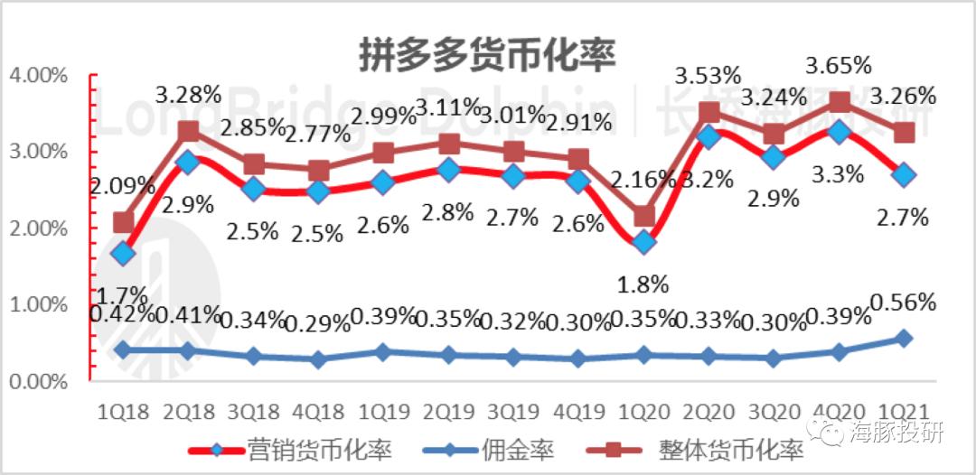 基于海豚君对于GMV的估算,拼多多这个季度广告变现率达到了2.7%,高于过往三年每个一季度的货币化率水平,拼多多在加快收割步伐。
