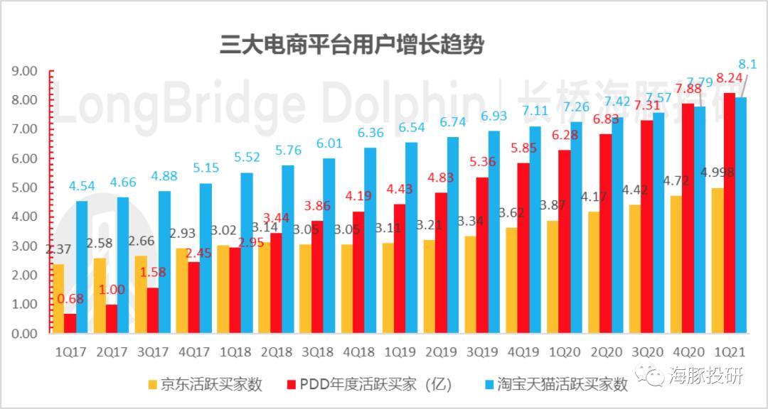 2. 活跃买家数上,本已突破淘系用户的拼多多,在净增上还跑超同行,即使没有春晚,当季也增加了3500万用户,达到了8.24亿,表现同样不俗。