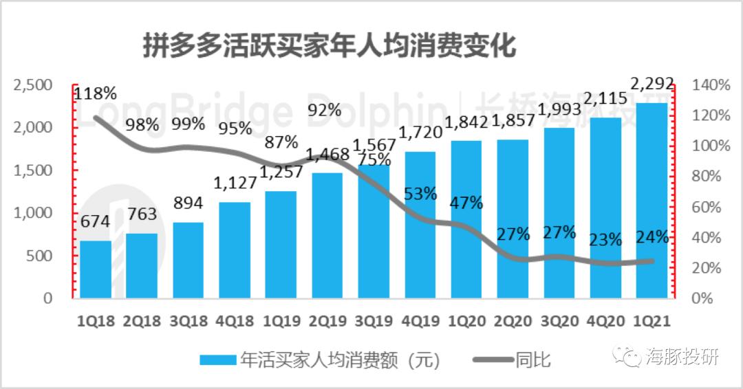 另外,基于海豚君对于GMV的估算,上个季度掉链子的核心指标——单用户人均消费金额也稳定下来了,一个买家过去12个月中在拼多多上买了2300元货值的商品,同比增长24%,还算不错。
