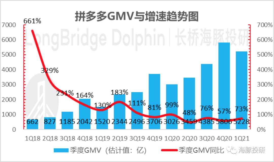 1. 虽然拼多多已不再报GMV,海豚君还是做了粗略估算(方法见下文详细解读),本季度GMV约超过5200亿,同比增长73%,远远高于市场50%-60%的增速预期。