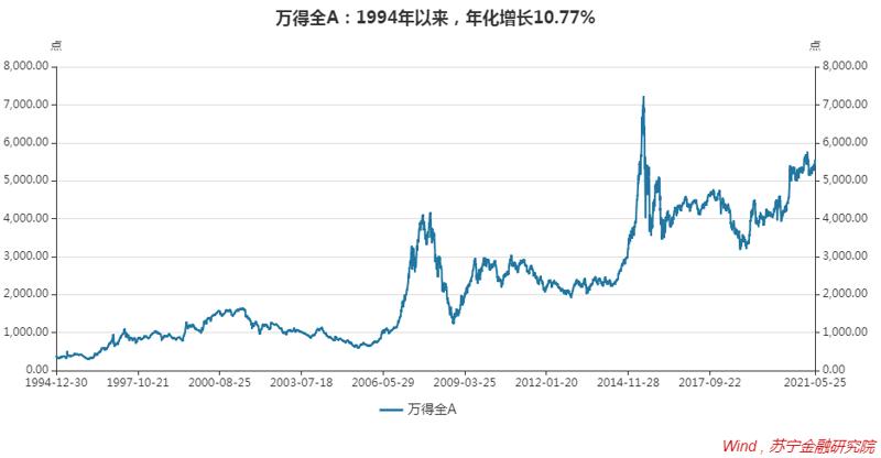 A股市场虽然常被投资者吐槽,但从长期持有的视角看,A股的赚钱效应丝毫不输美股。以覆盖沪深两市的万得全A指数来衡量,1994年-2020年,指数年化增幅为10.77%。这是个相当不错的成绩,若加上股息率,还要更高一些。只不过指数波动太大,大多数投资者因不能长期持有,不赚反亏罢了。