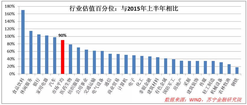 具体来看,与2015年上半年相比,当前市场估值的平均分位值为90%,仍不及2015年上半年的热度。分行业来看,超过100%的有四个行业,分别为食品饮料(170%)、休闲服务(114%)、银行(104%)和家用电器(102%),此外,汽车行业的估值热度也较高,为98%。