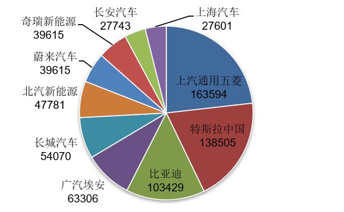 2020年纯电动车市场排名前十的厂商及销量(辆),来源:乘用车市场信息联席会数据,作者绘制
