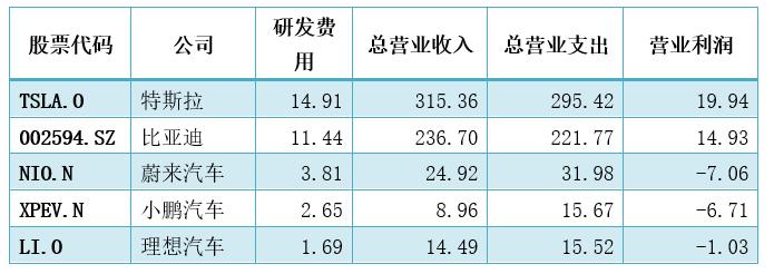 部分新能源汽车上市公司2020财年研发费用及营收利润情况(单位亿美元),来源:Wind数据,作者绘制