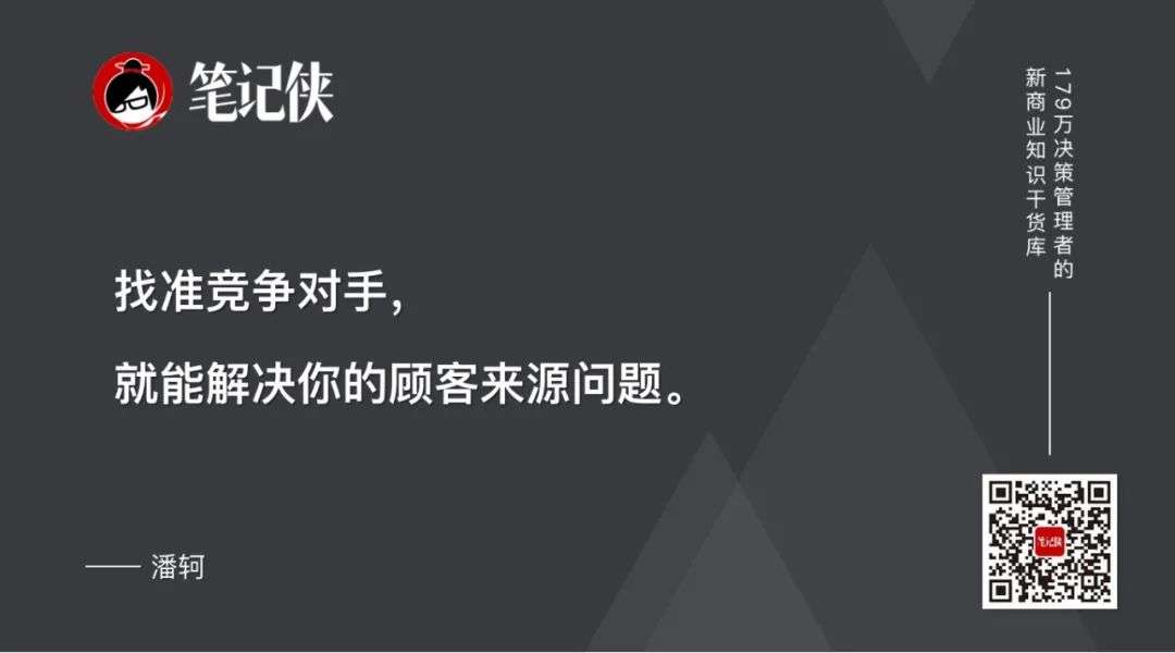 找准竞争对手,就能解决你的顾客来源问题,因为消费者不是从天而降的,他们是从竞争对手那里转化过来的;找到竞争对手,你就知道怎样想办法把他的顾客变成你的顾客。