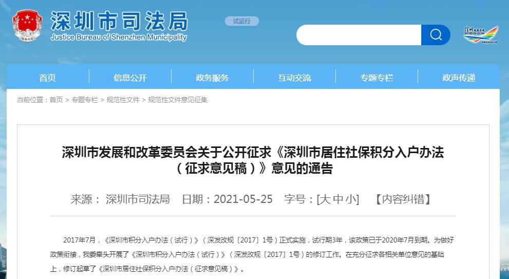 此外,据深圳市司法局5月25日消息,《深圳市居住社保积分入户办法(征求意见稿)》发布,现公开征求社会公众意见。
