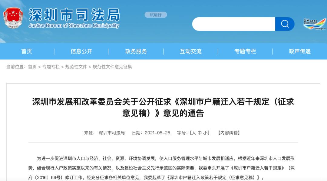 据深圳市司法局官网5月25日消息,近日,深圳市发展和改革委员会发布《深圳市户籍迁入若干规定(征求意见稿)》。主要修订内容速览: