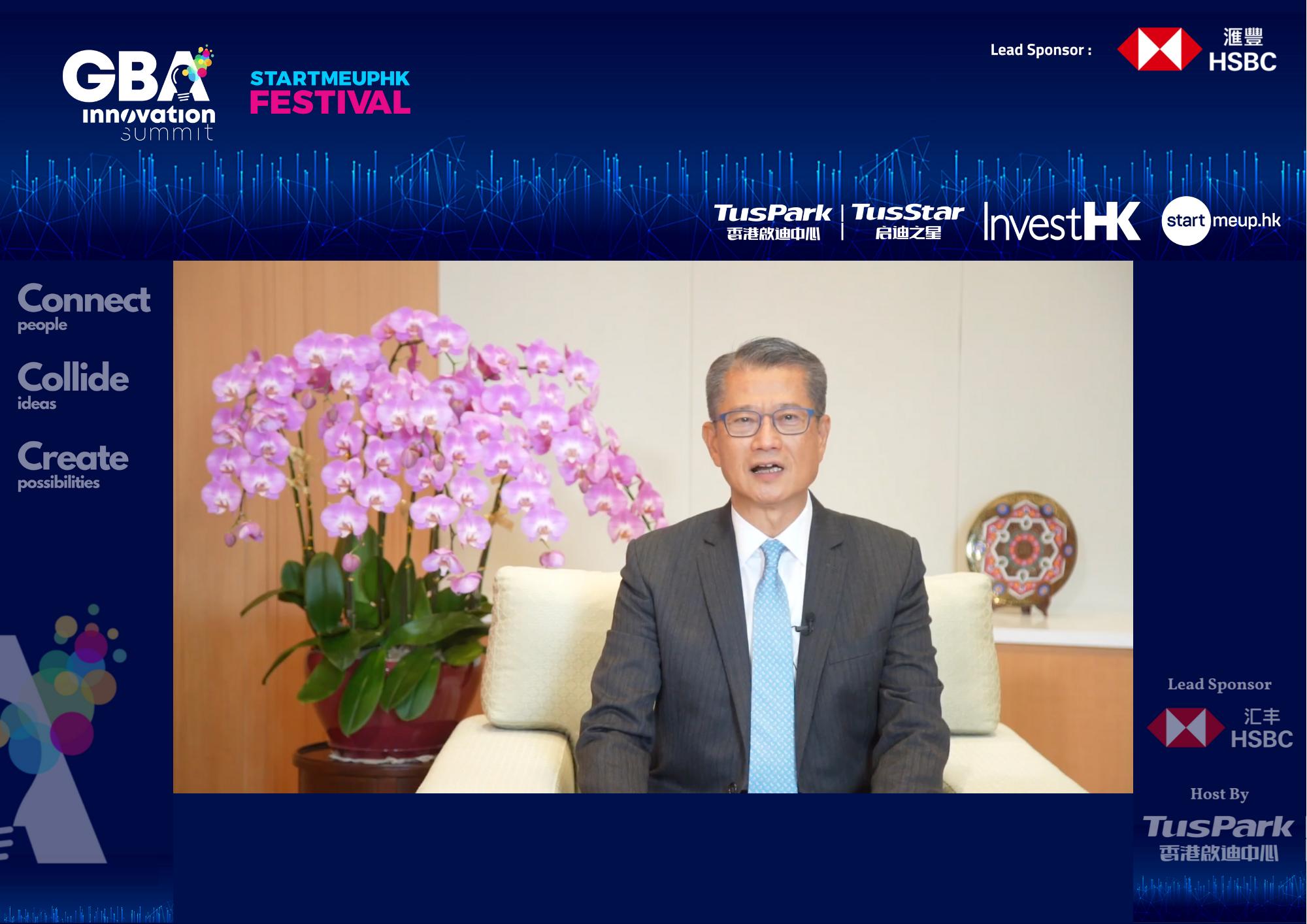 香港特别行政区政府财政司司长陈茂波在开幕致辞中表示,特区政府致力于推进大湾区建设国际科技创新中心,协助香港的科技初创企业在大湾区拓展业务,并为有兴趣进军海外市场的内地创科企业提供支援,积极发挥香港“引进来”、“走出去”的关键角色。大湾区内的创科合作取得良好进展,例如广东省于2019年开展了粤港澳联合实验室计划,在首两批共20所实验室中,19所有香港的大学参与建设。另外,广东省、广州市和深圳市的有关部门至今已批出超过1.6亿元人民币给香港的大学及科研机构进行研发项目或建立实验室,大大促进了区内科研资源的流动。