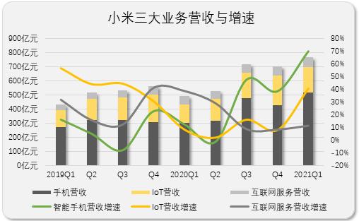 去年,小米调整战略为“手机×Iot”战略,从具体数据看,三大业务之间,手机与IoT的关系更为密切。营收占比上,手机重回高位,而增速上的带动效应不断强化。