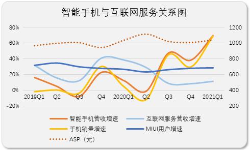 智能手机与互联网服务营收增速、手机销量与MIUI用户增速,两组关系,便能看出是每年卖出千亿价值的手机赚钱,还是依靠数亿MIUI用户的互联网服务赚钱。