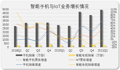 智能手机一季度实现营收515亿元,同比增长69.8%;成本449亿元,同比增长60.9%,其营收增速超过IoT、互联网增值服务以及被视为“边角料”的其他业务。同时,智能手机业务营收占比创下2019年以来的新高,占比高达67%,为近年新高。