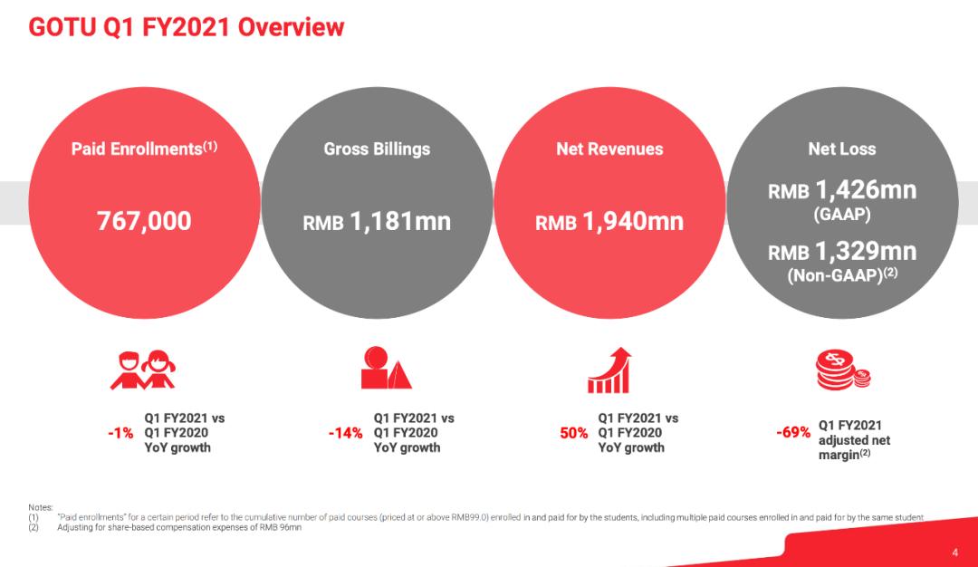 5月26日,高途集团(NYSE:GOTU)披露更名后一季度财报,财报显示截至2021年3月31日,高途一季度营收19.403亿元,同比增长49.5%;净亏损14.259亿元,去年同期净利润1.48亿元,由盈转亏。